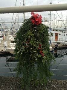 This time of year can be hard. Having the boats lighted seems to raise our moral. It is great! To add to the charm someone tied an evergreen wreath, complete with red ribbon and holly, to the fence near D/E Dock gate. It is a wonderful addition to the otherwise winter drabs.