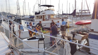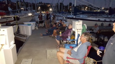 Sunday, E dock had an open-mic night followed by a movie at sunset! Several boaters on the dock provided singing, guitar, keyboard and harmonica talent for our neighbors’ enjoyment. At 8pm, everyone went home, grabbed a bite to eat, warm clothes and a chair and at sunset we rear-projected the movie Captain Ron on a screen on the back of a powerboat. Popcorn was served and about 20 people attended..some by dinghy. Great fun had by all!