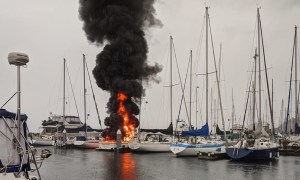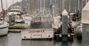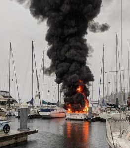 This morning a @30 foot power boat caught fire at slip P71. It started about 11:30 and was contained by the fire dept by 11:50. No other boats were involved other than slight damage to the vinyl dodger of the boat next door. No one was on board and when the first explosion occurred, a nearby liveaboard called 911.